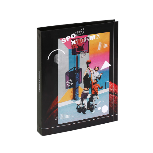 Ce classeur Sport est en carton rigide avec 4 anneaux en métal de 30 mm de diamètre. La tranche du classeur mesure 40 mm ce qui garantit une capacité de stockage maximale. La finition est en pelliculage brillant. Il existe 3 visuels en assortiment pour ce produit : Skate, Basket ou Motocross.